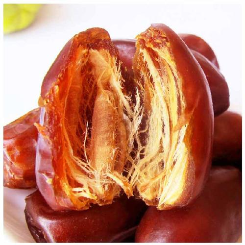 伊拉克蜜枣是金黄色的,非常粘,但不粘牙。枣核长圆,两头尖尖,核上还有一道沟槽,枣核与枣肉很容易分离。蜜枣肉质绵软,嚼起来劲头十足,口感非常甜。